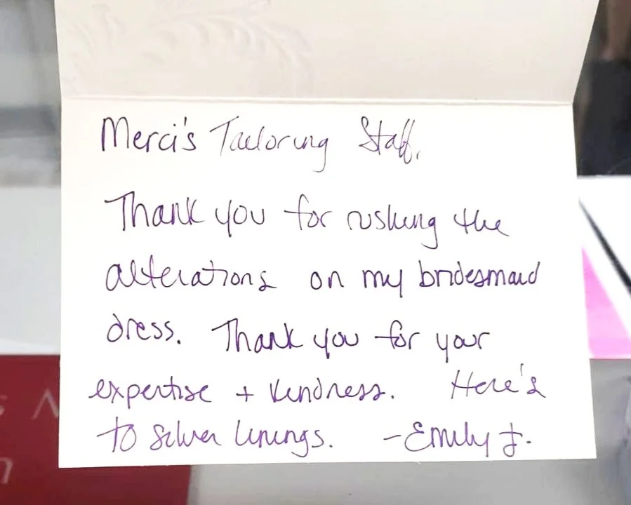 Reviews are essential to our success as a local small business. Thank you for the time to write us a review on the platform of your choice below. Review us on Facebook Review us on Yelp Review us on Google Review us on WeddingWire Review us on The Knot Thank you for your business & review!— The Merci’s Tailoring Family